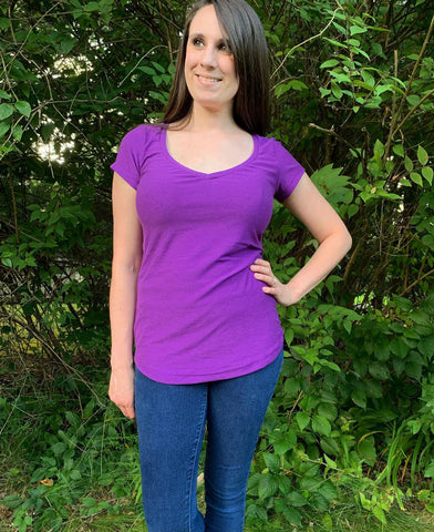 Last, but not least, a vneck! Lots of v necks fall low enough that you can pull them to the side and easily nurse your babe. V necks are another one that sewists lose confidence over, but with a good tutorial they’re not that bad. There is a great video in the SSE Sew-a-long group that shows how to do a vneck. For my vneck this time, I chose the New Horizons New Orleans Tee (aff link: https://newhorizonsdesignaffiliates=20f07591c6fcb220ffe637cda29bb3fs.com/?6). I love this pattern and it’s amazing in the cotton modal! Perfect for the end of summer, then I can throw a denim jacket on and wear it into fall.